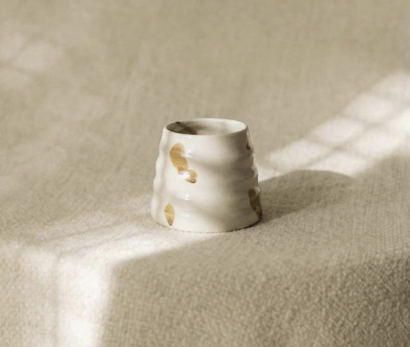 Glasyren Fröhus kombinerar ett rustikt och lekfullt uttryck med sin lena, blanka yta i kombination med de jordfärgade fläckarna. Den transparanta glasyren visar stolt upp den brutna, ofärgade leran. Koppen har en minimalistisk framtoning och ger ett modernt, skulpturalt uttryck som passar både i det lantliga hemmet och det mer moderna.